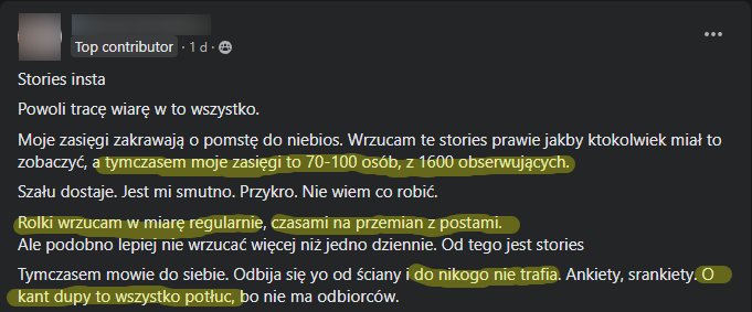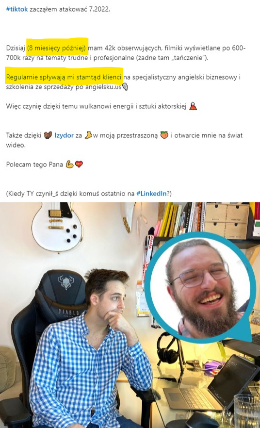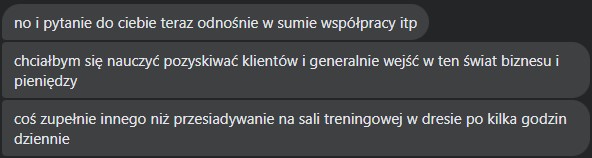 Ostatnio wszedłem na konto jednego z “Najlepszych Trenerów” pewnej platformy społecznościowej. Zjechałem do sekcji rekomendacje. Ku mojemu zdziwieniu na ponad 300 rekomendacji na żadnej z nich nie było mowy o efektach w postaci klientów czy zapytaniach o ofertę. A wydaje mi się, że zapisując się na kurs/szkolenie/usługę tego chcemy najbardziej. Prawda? Ale wcale mnie to nie dziwi. Sam korzystałem z pomocy 3 “ekspertów” od mediów społecznościowych. Zawsze kończyło się tak samo. Wchodzę do nich. Duża społeczność. Można sobie wrzucić swój post, “żeby podbić zasięgi”. Ludzie komentują i lajkują. Później trzeba zrobić im to samo… Okazuje się nagle, że strzeliły 3 godziny jak siedzisz na platformie. Prawie pół dnia pracy, a w sumie nic się nie zrobiło. W dodatku trzeba doliczyć godzinę, którą się spędza na napisanie treści. 40 minut z tego to zazwyczaj myślenie "o czym tu napisać?" i wpatrywanie się w białą kartkę. Plus 100 poprawek po napisaniu, żeby na pewno zażarło i poszło to “viralowo”. I ostatecznie kończy się klapą… Wszyscy coachowie tłumaczą Ci pewnie, że trzeba być cierpliwym. W końcu zażre. “Niedługo będą klienci. Tylko twórz treści regularnie.” Muszę Cię rozczarować… Nie będzie klientów. Jeżeli obecnie nie jesteś w stanie zmonetyzować swojej widowni (niezależnie ilu masz teraz obserwujących) to nie będziesz w stanie jej zmonetyzować mając nawet 100 tys. Skąd to wiem? Przewiń do szczegółów Wytrwałem 1,5 roku CODZIENNEGO postowania. Skąd to wiem? Wytrwałem 1,5 roku CODZIENNEGO postowania. O ilości godzin networkingu nie wspomnę. 3 klientów. To była ilość moich klientów. Spytasz co z zasięgami? 660 tys. w 2022 r. Ponad pół MILIONA! OBRAZ Po tej sytuacji doskonale wiem, że regularność nie jest gwarancją wyników. Myślałem, że gram w długoterminową grę. Jednak po prostu grałem w złą grę… I jeżeli dalej bym ją kontynuował to by mnie doprowadziła do konta z dużą ilością obserwujących i pustego portfela. No i oczywiście tysiąca zmarnowanych godzin, wysiłku na marne, tylko po to, aby zrozumieć, że niezależnie ile czasu bym na to poświęcił to i tak bym nie miał pożądanych wyników. Pytanie do Ciebie: Jak to jest, że trafiałem do takiej ilości ludzi, a klientów było tyle, co pies napłakał? Nie potrafiłem pisać treści, które GENERUJĄ ZAPYTANIA O OFERTĘ. Wszystko rozbijało się o typ “Przynęty”, którą rekomendowali mi “guru”. Używałem ich templatek. Nie działało, więc zwalali na algorytm. A BRAK ZAPYTAŃ przyklepywali progresem w zasięgach, który udało mi się wygenerować. Jednak to mnie zupełnie nie satysfakcjonowało.