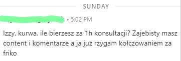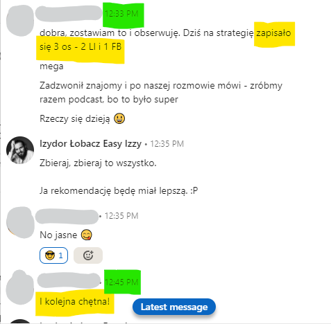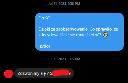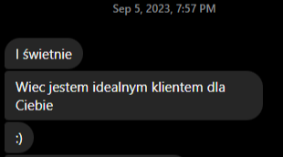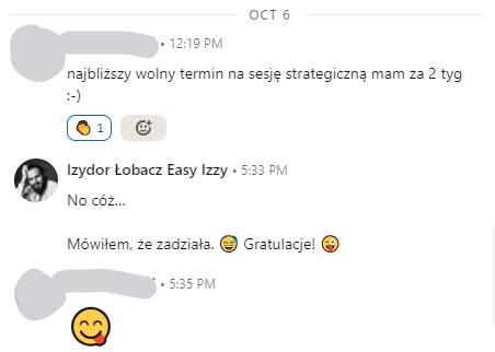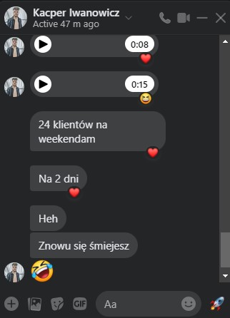 Bo oni są od “wzrostu obserwujących”, a nie “wzrostu zapytań”. Dzisiaj już wiem, że “wzrost obserwujących” nie ma nic wspólnego z monetyzacją. Pomimo, że może Ci się wydawać, że więcej obserwujących = więcej klientów. Jednak to tak nie działa. Budowanie widowni, a monetyzowanie jej to 2 różne umiejętności. Jeżeli nie jesteś w stanie ZMONETYZOWAĆ 100 obserwujących… nie będziesz w stanie zmonetyzować nawet i 100 tys. Mam nadzieję, że już rozumiesz dlaczego wszyscy “social media guru” obiecują Ci “wzrost obserwujących”, a nie “wzrost zapytań”. Bo nie potrafią zmonetyzować widowni. A jeżeli już to jedynie swoją. Dzisiaj doskonale wiem, że dopiero wzrost zapytań o ofertę przekłada się na zwiększenie sprzedaży. Nie wiem jak Ciebie, ale mnie nie interesuje budowanie konta tylko po to, aby było duże. Za lajki i komentarze typu “Super post” chleba sobie nie kupimy. Mi zależy na monetyzowaniu i budowaniu dźwigni biznesowej, która napędza mój biznes i będzie ułatwiać jego prowadzenie w przyszłości. To ma być aktywo, a nie obciążenie. Nie interesują mnie puste lajki czy liczba obserwujących. Interesują mnie realne ZAPYTANIA O OFERTĘ od IDEALNYCH KLIENTÓW. Jeżeli nie ma którejś z tych dwóch rzeczy w równaniu to jest to dla mnie bezwartościowe. Budowanie ogromnych widowni czy skupianie się na ilości obserwujących nie ma sensu. To są próżne metryki, które łechtają jedynie ego. W których budowanie wiele osób daje się wciągnąć przez kłamstwa jakie marketingowcy i trenerzy social media byli w stanie tym ludziom wmówić. Jak otrząsnąłem się z marazmu i mydlenia oczu po ponad 2 latach stwierdziłem, że… Czas skończyć to błędne koło i dojść co tak naprawdę wpływa na sprzedawanie na platformach. Zanim powiem Ci, co odkryłem i jak to zrobić, kilka słów o mnie: Nazywam się Izydor Łobacz. Ludzie mówią do mnie Izzy. W łatwy sposób otwieram drzwi do Twoich klientów. IzzyDoor (Ale suche…) Nie jestem żadnym “social media guru” czy “coachem wzrostu”. Absolutnie się na tym nie znam. Bo nie muszę. Mało kto mnie zna w świecie marketingowym. Nie zależy mi na “budowaniu” wielkich widowni. Moje wszystkie konta łącznie z prywatnym Facebookiem na którym dodaję ludzi od 2010 r. mają maksymalnie 8 000 osób. (łącznie z listą mailingową) Mało tego! Stoję totalnie w opozycji do tego co mówią “marketingowi specjaliści”. I to mnie właśnie od nich wszystkich odróżnia. Oni skupiają się na zasięgach i “wzroście” kont. (z którymi później nie ma co zrobić) Ja skupiam się na monetyzowaniu widowni. I najlepsze jest to, że używając “Przynęty na Wieloryby”, o której zaraz powiem, możesz generować zapytania o ofertę od pierwszego dnia. Niezależnie jak silną masz markę czy ilu obserwujących posiadasz. (za chwilę zobaczysz o czym mówię i pokażę Ci dowody na to.) Zgłaszają się do mnie osoby na sesje, które mają >30 000 followersów tylko na jednej platformie i po 250 reakcji pod każdym postem. Dlaczego? Bo mało kto pyta o ich ofertę. A jeszcze mniej osób chce zapłacić za to co oferują. Social selling (sprzedawanie przy pomocy social mediów) robiłem już od 9 lat. Nawet nie wiedziałem, że to się tak nazywa. Wychodziło mi to lepiej bez rad i bez wiedzy niż z radami… A teraz ludzie polecają mnie innym: OBRAZ z poleceniami Wiem jakie możesz mieć... Przekonania co do generowania sprzedaży przez social media: to zajmuje dużo czasu muszę publikować codziennie/trzeba dużo publikować muszę mieć dużą społeczność muszę mieć zbudowaną silną markę wszyscy to już robią i trudno się wybić pozyskiwanie klientów przez social media nie działa żeby sprzedawać muszę być nachalny i uprawiać “pitch-slapping” W większości przypadków to niestety tak wygląda. Ale w Twoim wcale tak być nie musi. Oto dowód: 17 lipca opublikowałem swój pierwszy post na Instagramie na nowym koncie. 28 sierpnia opublikowałem swój 7 post Dodatkowo wstawiłem z 3 stories. Po 42 dniach miałem 21 zapytań o ofertę przy zaledwie 107 obserwujących i 7 postach! Część bezpośrednich, część pośrednich. Wiem, że możesz być sceptyczny. Też bym był. Dlatego na to też mam dowód. Tutaj kilka z nich: OBRAZY